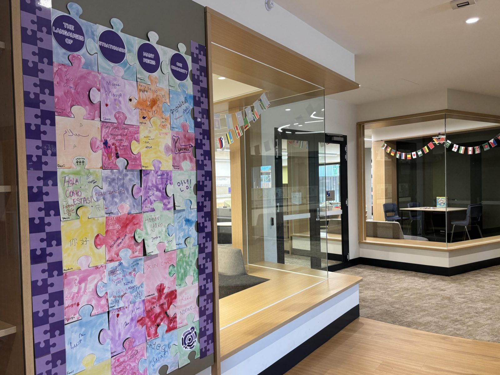 During orientation and the first week of school, families were invited to write “Hello,” “Greeting,” or a “Blessing” in their home languages on puzzle pieces. Students decorated and painted these pieces, which now hang in the foyer as the first thing visitors see when entering the building.