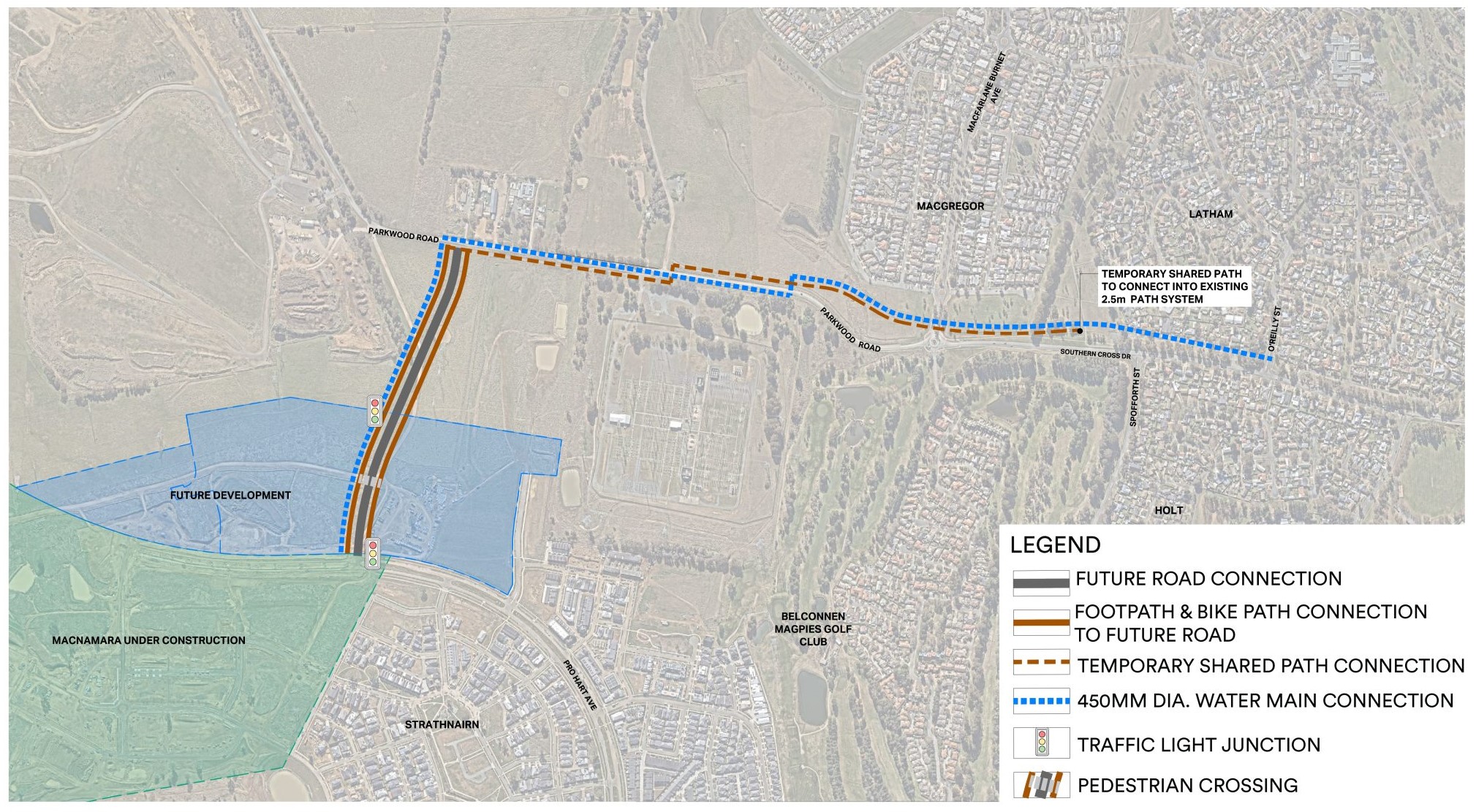 The road connection forms part of the broader off-site infrastructure works supporting the Macnamara Estate Development Plan 2, ensuring that essential services and access routes are in place for further residential development.